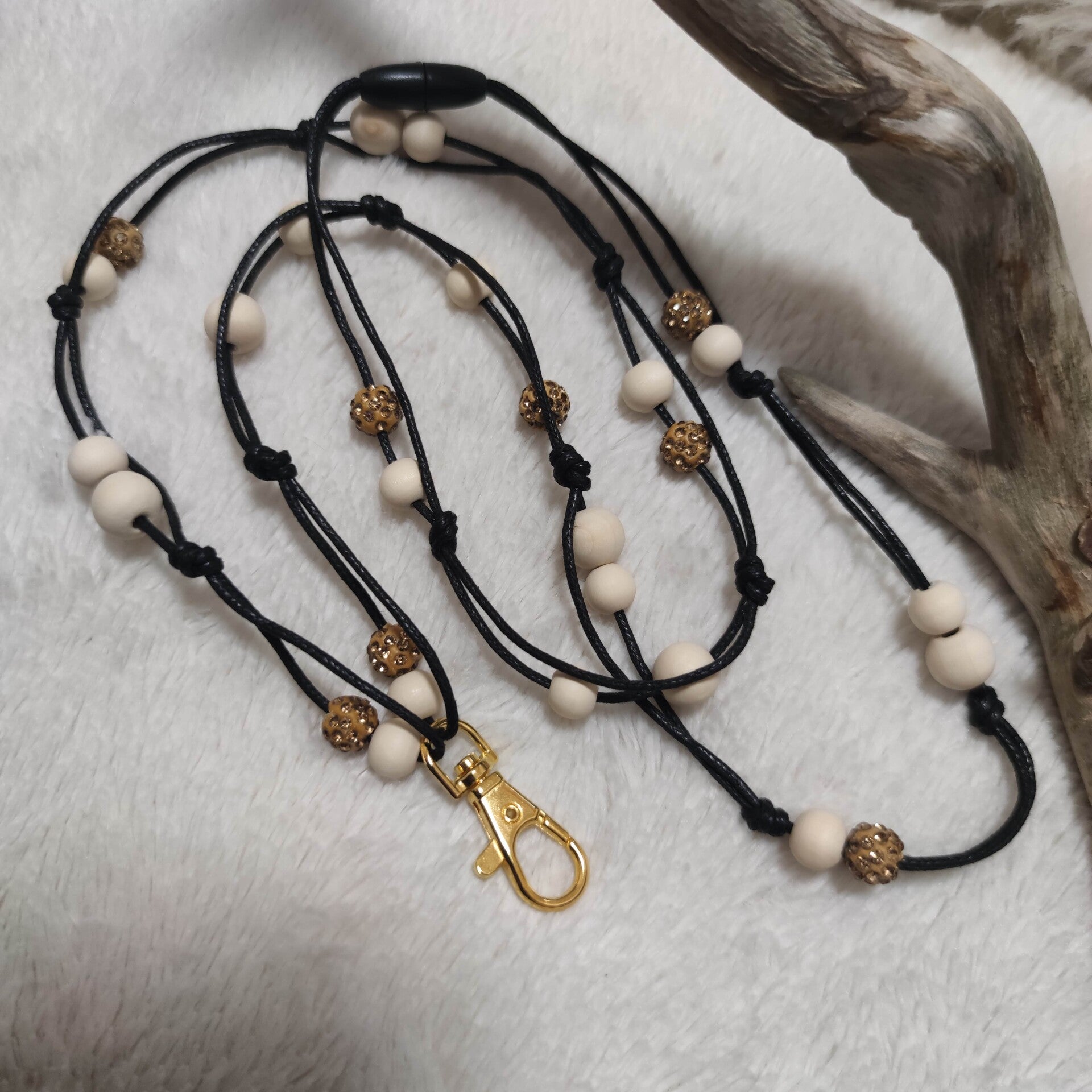 Vaalealla puuhelmillä sekä beigellä kimalle helmillä